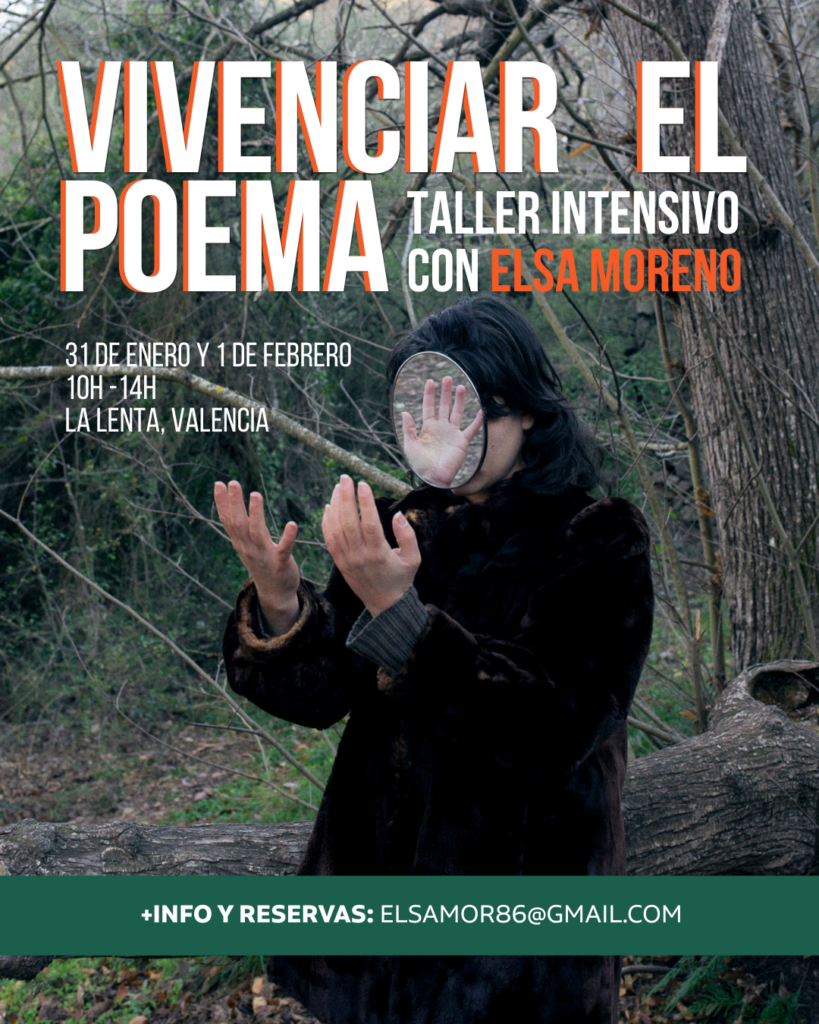 VIVENCIAR EL POEMA Taller intensivo de Poesía y Cuerpo, por Elsa Moreno 31 de enero y 1 de febrero, de 10h a 14h, en La Lenta (Plz. Vicent Iborra, 9, València) Precio del taller: 80€ Reservas: https://forms.gle/vKLipA88YRq1bJ38A Descripción: Una exploración sobre la conexión entre el cuerpo físico y la creación poética. Un viaje en ambas […]