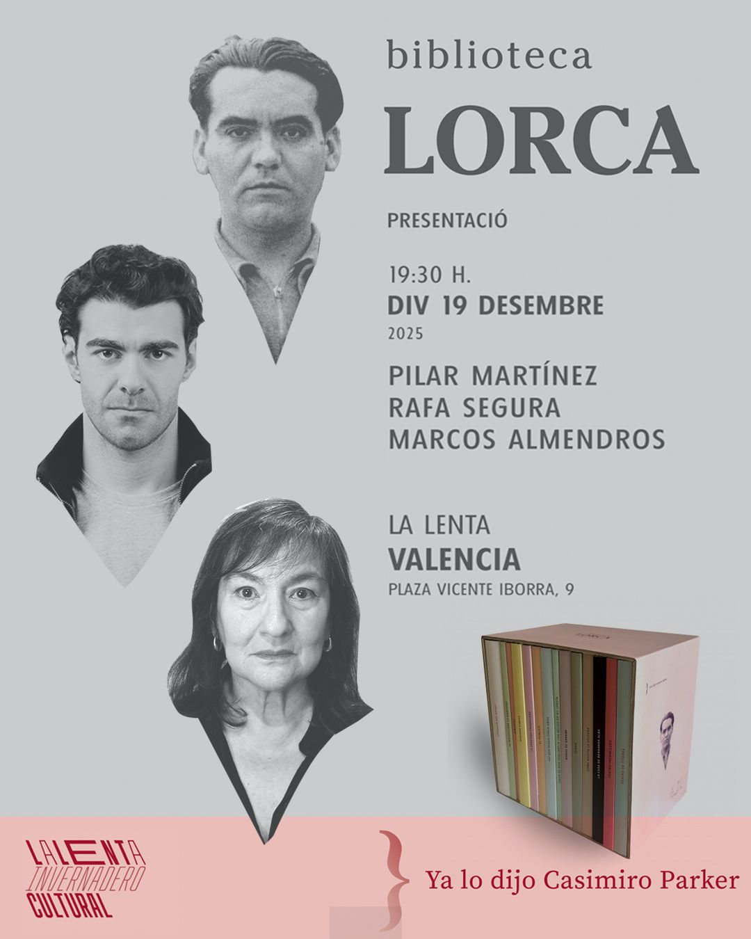Junt amb l’editor Marcos Almendros, ens acompanyen dos actors i poetes ben coneixedors de la obra lorquiana: Rafa Segura i Pilar Martínez. Rafa Segura ha estat intèrpret del mateix Lorca a la obra ‘Jose Antonio y Federico’ de Francachela Teatro. Pilar Martínez és autora del muntatge escènic ‘En la luna’ (residència Sala Carme Teatre), un viatge cap a la lluna a la recerca de Federico.