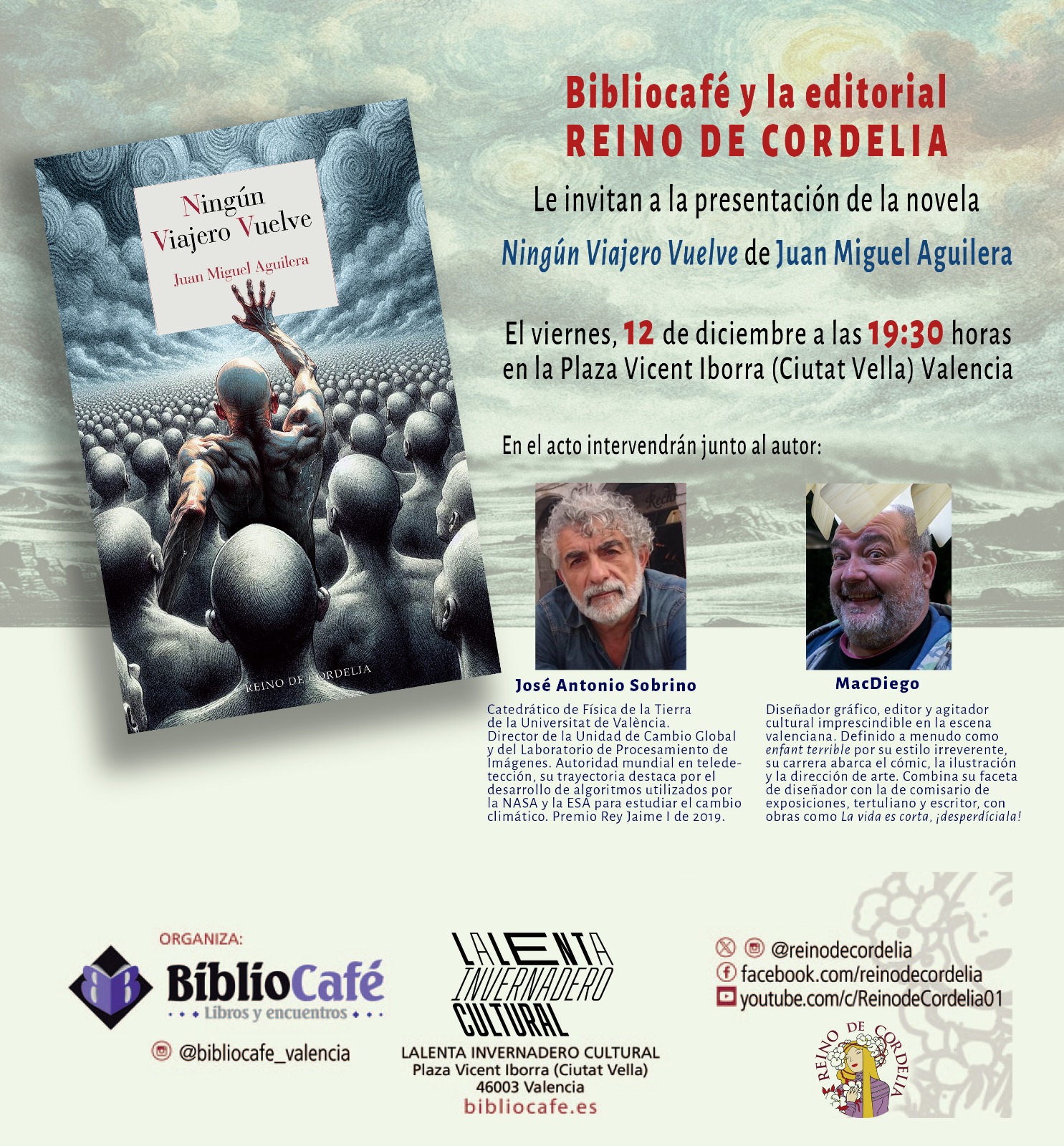 Bibliocafé i la editorial Reino de Cordelia organitzen la presentació de ‘Ningún viajero vuelve’, la recient novel·la de Juan Miguel Aguilera, un dels noms imprescindibles de la ciència ficció en Espanya. Autor guardonat, renovador del gènere i referent des dels anys 80, Aguilera torna a sorprendre amb una novel·la poderosa i visual que demostra la seua extraordinària capacitat per aunar imaginació, rigor i emoció.