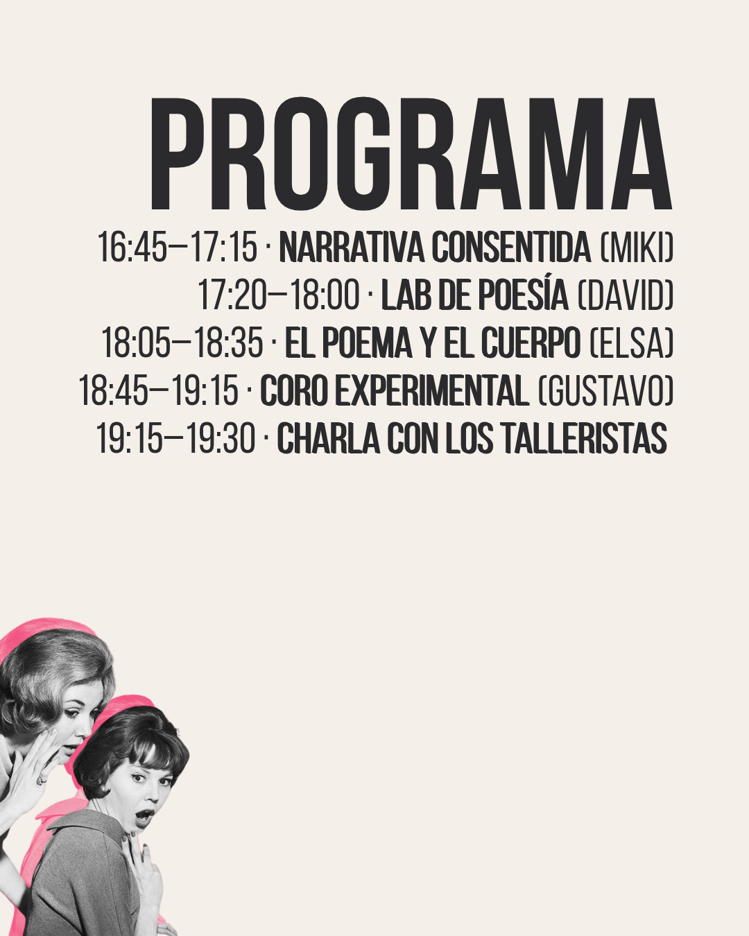 Cada tallerista dará una explicación de su curso, su metodología, alguna breve práctica y responderá a todas vuestras dudas.